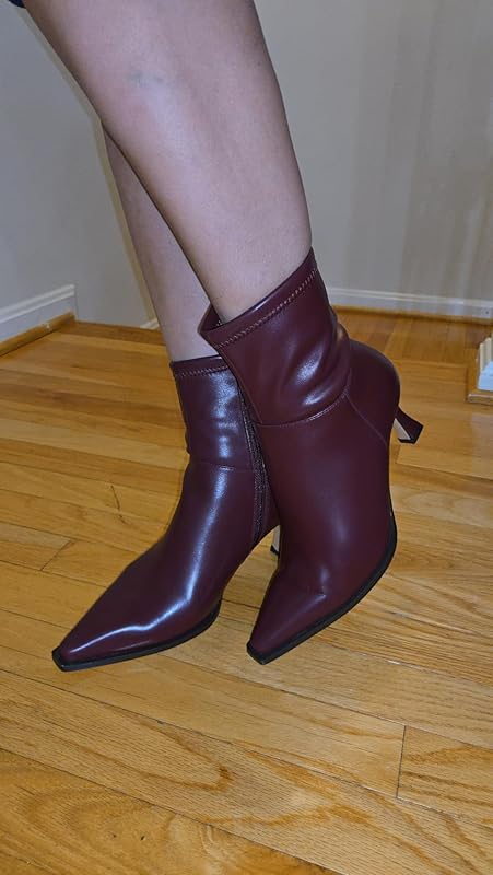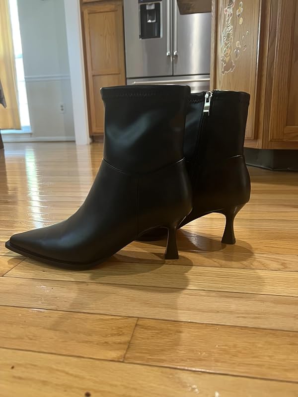 These ankle boots exceeded my expectations. The material feels high-quality, and the finish is elegant. The pointed toe and slim heel give them a modern and sophisticated style, perfect for pairing with casual or dressy outfits. They’re comfortable to walk in, don’t rub, and the side zipper works smoothly. Plus, the elastic at the top helps them fit snugly without being too tight.I’ve worn them several times, and they still look brand new. Highly recommended!